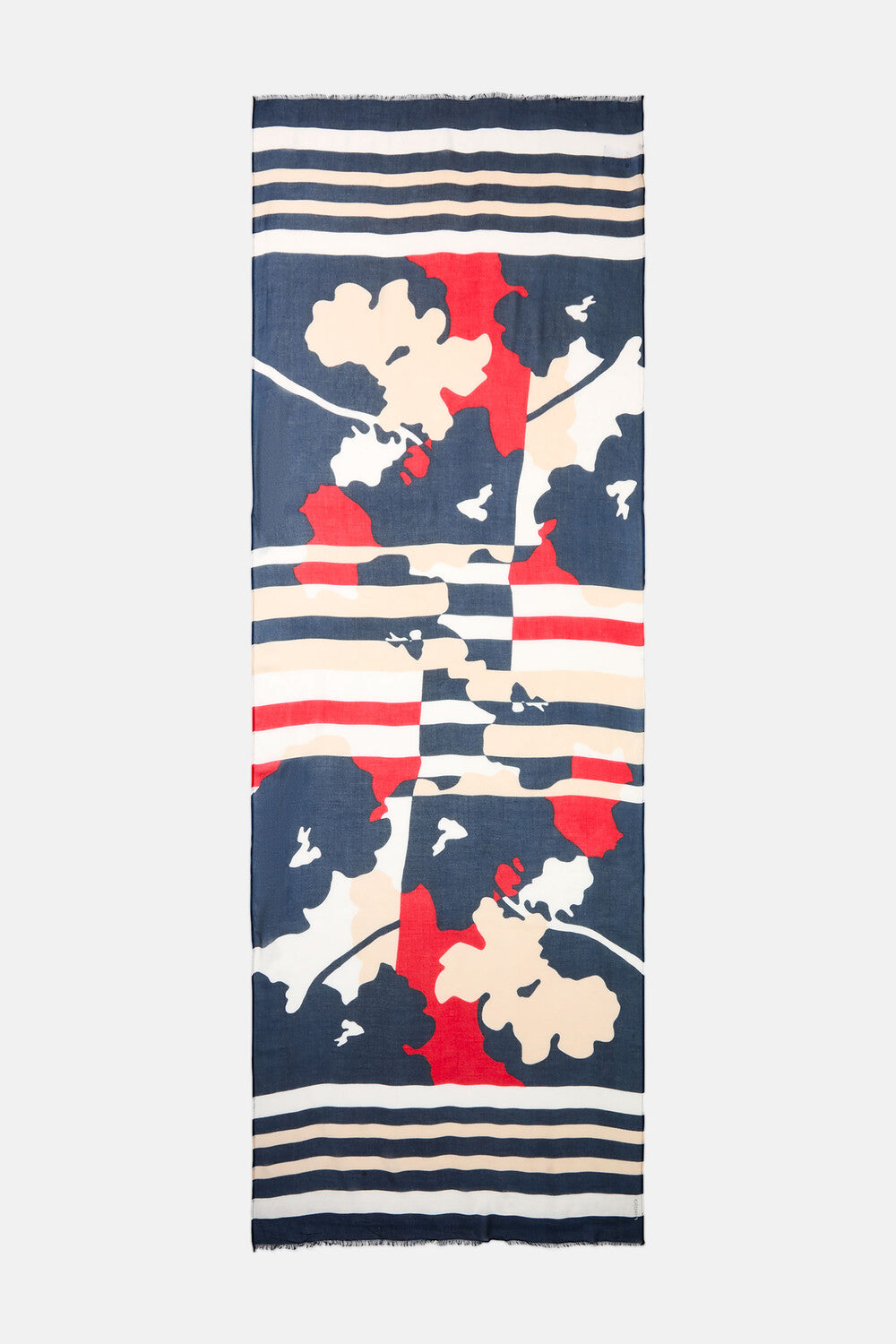 An Olsen scarf refined with a modern panneaux design that cleverly combines floral motifs and stripes. The soft surface ensures a comfortable feel, while the open edges give the accessory a casual touch. A versatile scarf that instantly gives colour and expression to any outfit. Length approx 195cm.